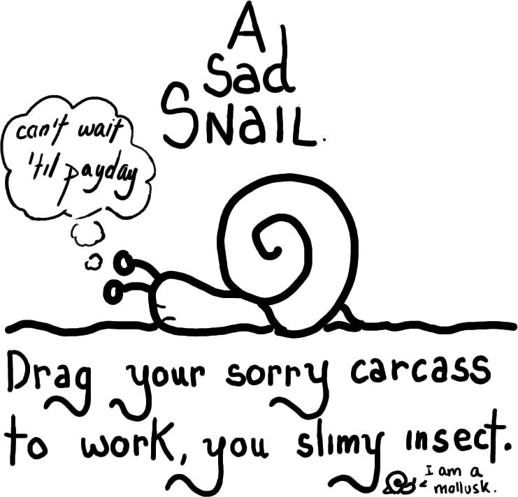 A snail is a mollusk. This adds to the offensiveness of the entire picture; on top of ordering the poor snail around, they can't even get its kind straight. The snail does all it can, but he can only go so fast. The snail consoles itself with the prospect of what good is to come, only to realize that it will all start over again in a nauseous cycle. The snail is sad, for he asks itself how good can the payday be, when he spends his life trying to get to work? Only getting there takes the snail, like, 4 hours, and it's just crawling some few meters! The snail leaves a trail of slime in its path; the painful evidence that all he leaves for posterity is a trail of icky goo that will fade without even anyone noticing makes the snail even sadder. But does the snail do anything to change all of this? No... he just sadly looks forward to payday. This is the story of the snail. Some would infer that this is an allegory on the bulk of society, but it's just a damn story about a snail! Don't try to be smart on me, dammit!);
