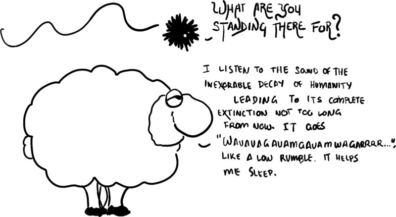 I am sure you can hear it too. You don't even need to pay attention... it's everywhere around you. From the paper you write on to the food you eat, you can see it everywhere. Anywhere you look, anything you do. Let's just lie down and die, it will be faster that way.);