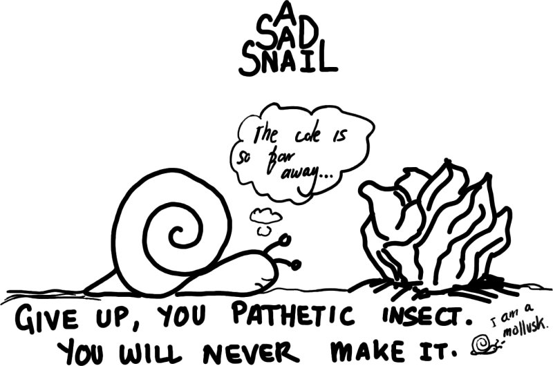 The Sad Snail has a dream. It dreams of eating cole. It has worked long and hard to get so near it; it has spent all day just to get so close. The Sad Snail is so close, but yet so far away. The perception of this truth discourages it, and makes it wonder if the cole is really worth it, if all those lush pale green leaves are truly worth this much struggle. The Sad Snail knows that only some more effort will grant the final prize. All it needs is a little encouragement... a few kind words to keep it going until the end. But the Sad Snail is brought down by those that don't believe in it, and thus loses all hope to accomplish his goal, even when he was so close. So close... and yet so far. The Sad Snail will never make it there now. This is the tale of the Sad Snail's dreams.);