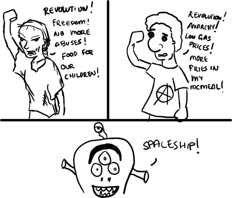 Because you can never have enough fries in your MacMeal. Times have changed, my friends. To quote "Fight Club", 'We're the middle children of history: no purpose or place. We have no Great War, no Great Depression. Our great war is a spiritual war. Our great depression is our lives.' But we do have big-headed aliens yelling about their spaceship.);