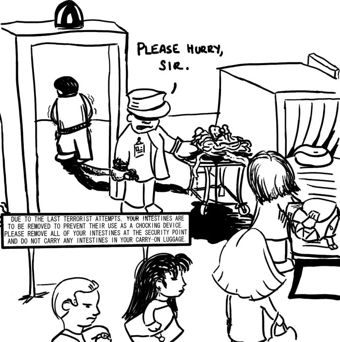 Where do we draw the line? I wonder. Needless to say, I went through countless security checkpoints at the airports. To enter a US flight, every single person is patted down and scanned... forming a line that turned and twisted endlessly, much like your intestines, but without all the blood and goo. Anyway, they took my bar of deodorant, because (gasp) it's just not allowed in a plane anymore. I refrained from saying that, if she took that from me, I would release the toxic gases I had stored in my body into the plane - because, you know... she would have taken me seriously and I'd have been taken into custody.);