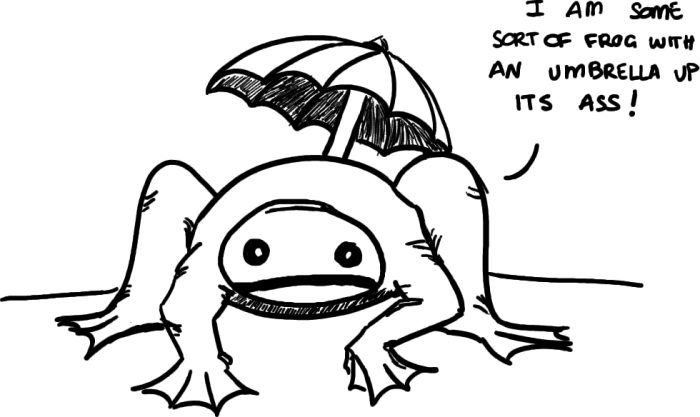 It tells you just in case you were wondering. You might relate to this if you are prone to making random doodles when you are idle. You see, someone else sees whatever you are drawing and they immediately ask you, "So what is it?"... most of the time, at least for me, it's just nothing, simply some totally random byproduct of whatever other thing I'm doing. Since I became a bit tired of being asked this, I guess I subconsciously began having all the drawings say some sort of explanation as to what they are. And therefore, the strange froggish creature with an umbrella lodged up its rectum tells you that it is some sort of frog with an umbrella up its ass. So no-one has to figure it out!);