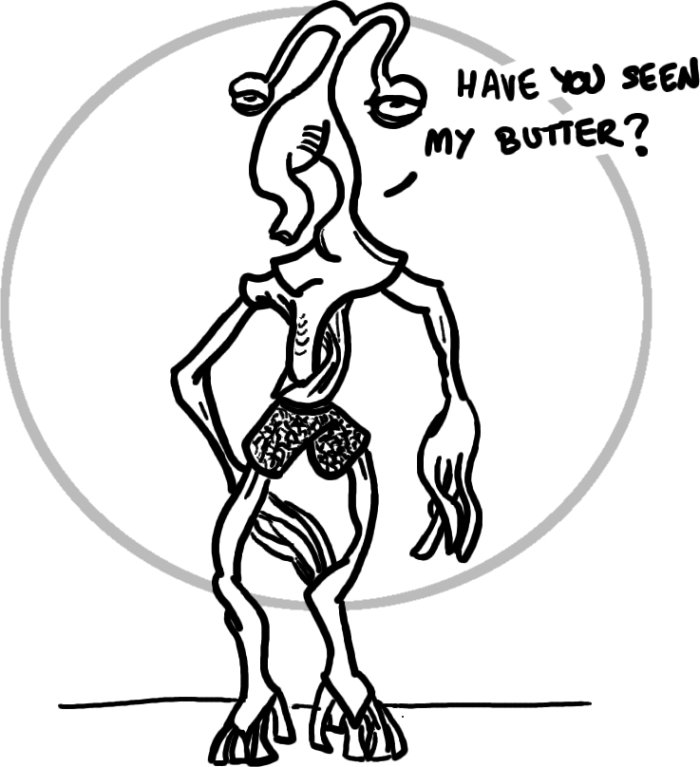 The Buttermonger not only controls the intergalactic butter trading and manufacturing network, but utilizes it as its only sustenance. Butter is the Buttermonger's life. Every Buttermonger knows by heart the list of five hundred and sixty four Uses for Butter Known in the Universe, and any of them will be eager to recite it to you, should you ask. They say that if you are capable of coming up with an use that is not in said list, the Buttermongers will make you one of them. Whether this is a distinguished honor or a horrible punishment is yet to be determined to this day.);