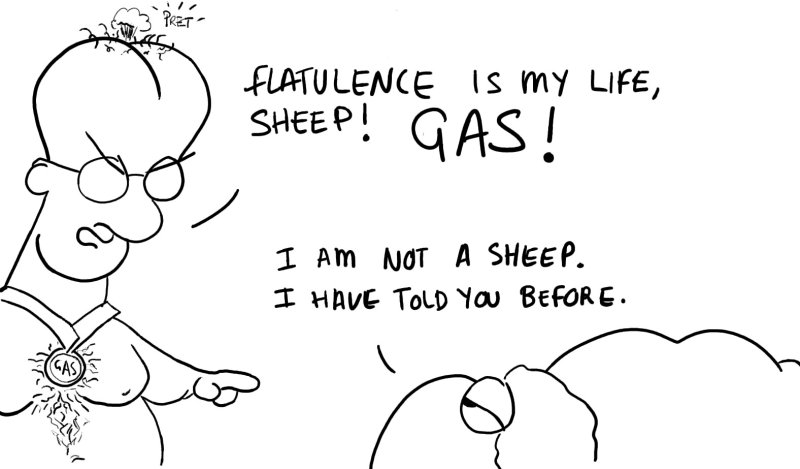 Professor Gas is a man that has been awarded a custom-made medal for having a butthole on his cranium, gluteal masses and fat included, or "for having a bottom at the top", as some would have it. Obviously, he doesn't have two digestive systems: logic tells us that this is a refrigeration device. The gears and hydraulics in his brain overheat, and are designed to periodically release a gust of pressurized gas or, as would commonly be described, to produce "brain farts". Medal-worthy indeed.);
