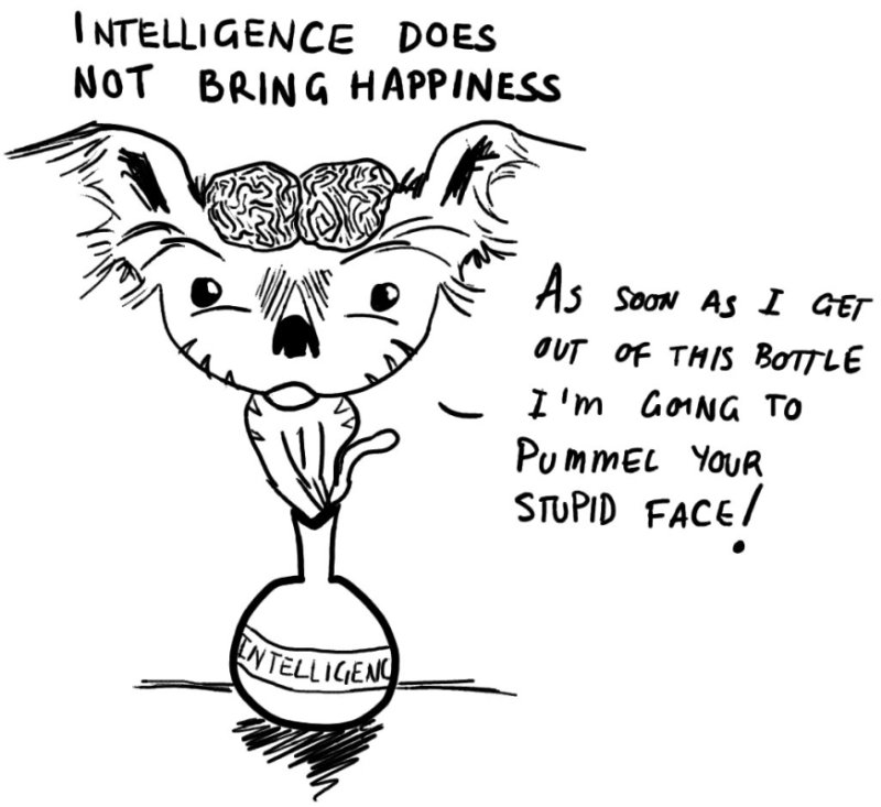You never know when a super-intelligent squirrel/koala look-alike will pour out of a bottle that turns out to be an inter-dimensional container to pummel your face in. Like it says, intelligence does not bring happiness!);